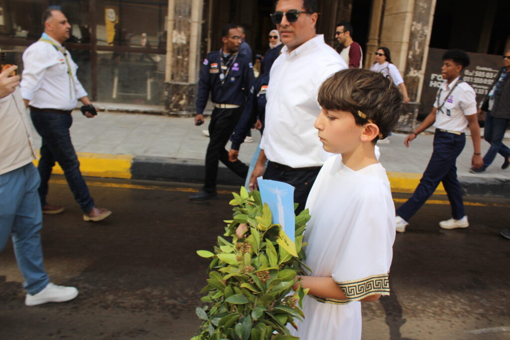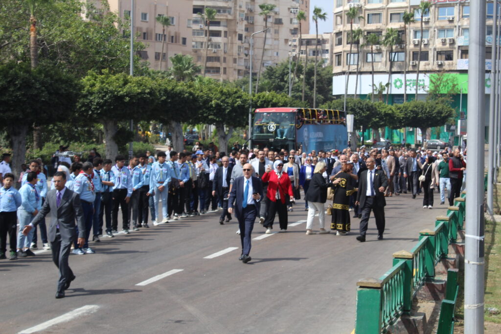 Επόμενο ήταν να τιμηθεί η Νύφη της Μεσογείου, ενδεδυμένη τα γιορτινά της, για να βιώσουμε όλοι οι διαβιούντες σ αυτήν, την χαρά, την τιμή και την υπερηφάνεια, αρχής γενομένης με την πολυπληθή παρέλαση που συμπεριλάμβανε το προανάκρουσμα της Επετείου! Αυτή ξεκίνησε στις 10 π.μ. από το Ελληνορωμαϊκό Μουσείο μέχρι το άγαλμα του Μεγάλου Αλεξάνδρου, προεξάρχοντος του Κυβερνήτη της Αλεξάνδρειας, μηχανικού Ayman Attia, του Δρ Abdul Aziz Gansawa, Υπουργού Τριτοβάθμιας Εκπαίδευσης και Επιστημονικής Έρευνας, και του Δρ Ahmed Zayed, Διευθυντή της Βιβλιοθήκης Αλεξανδρείας, την οποία είχε διοργανώσει το Κυβερνείο Αλεξανδρείας, με σύνθημα «Αλεξάνδρεια: Γέννηση μιας παγκόσμιας πόλης», σε συνεργασία με την Ελληνική Πρεσβεία, την Ελληνική Κοινότητα Αλεξανδρείας, τη Βιβλιοθήκη Αλεξανδρείας, την Αρχαιολογική Εταιρεία Αλεξανδρείας και το Γενικό Προξενείο της Ελλάδας στην Αλεξάνδρεια και το «Ελληνικό Ινστιτούτο Έρευνας Αλεξανδρινού Ελληνικού Πολιτισμού» με την ιδιαίτερη προσφορά της αρχαιολόγου κας Παπακώστα.