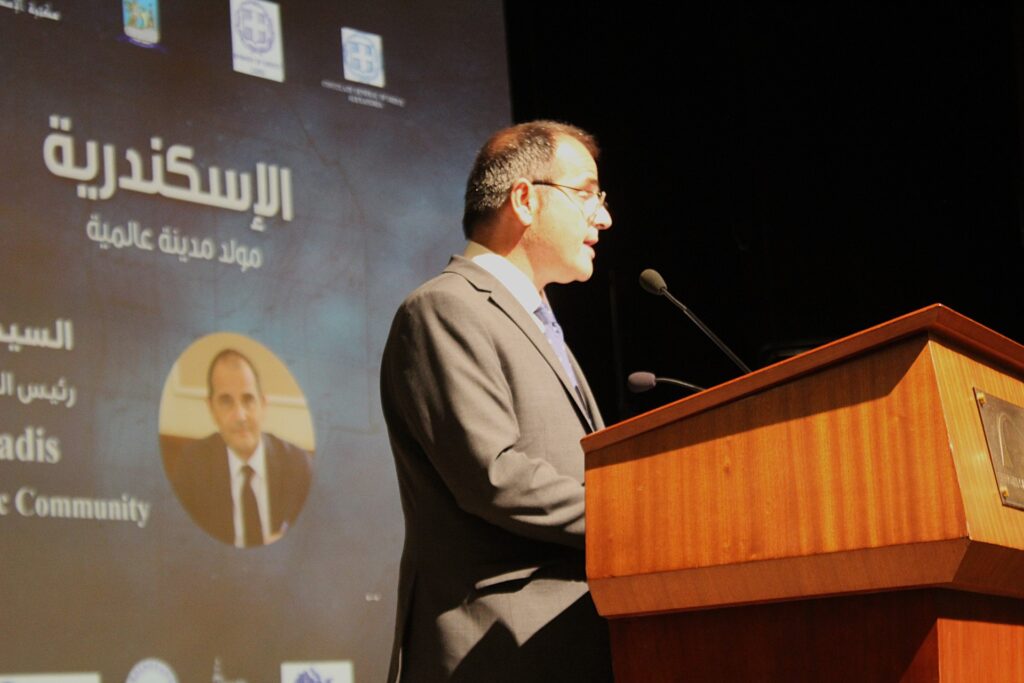 Είπε ότι η Ελληνική Κοινότητα Αλεξανδρείας, ιδρύθηκε το 1843 και είναι υπερήφανος που αποτελεί την πρώτη μη κυβερνητική οργάνωση, που λειτουργεί μέχρι και σήμερα με στόχο να αποτελέσει γέφυρα αγάπης μεταξύ Αιγύπτου και Ελλάδας. Ολοκλήρωσε την ομιλία του λέγοντας: «Γεννηθήκαμε και η Αίγυπτος έγινε πατρίδα μας, ενώ η Αλεξάνδρεια είναι στις καρδιές μας, γιατί μας ενώνει και υπάρχουμε ως μια αληθινή αδελφότητα, βασισμένη στην αγάπη, τον σεβασμό και τη συμμετοχή στην οικοδόμηση αυτής της πατρίδας».