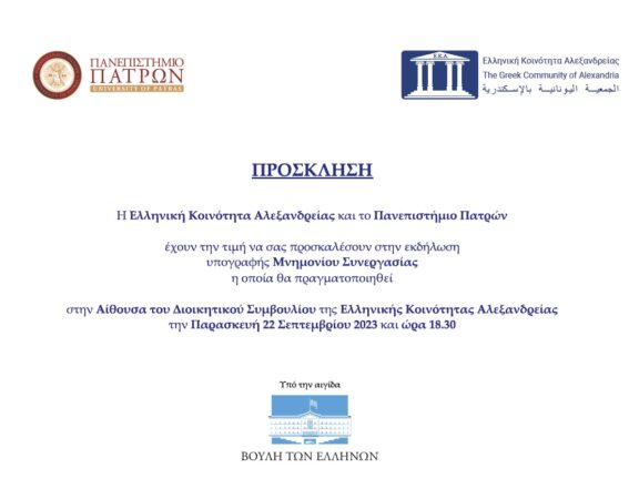 Σήμερα Παρασκευή 22α Σεπτεμβρίου 2023 και ώρα 06:30 μ.μ. στα Γραφεία της Ελληνικής Κοινότητας Αλεξανδρείας, Εκπρόσωποι του Πανεπιστημίου Πατρών, θα συναντηθούν στην Αίθουσα των Μεγάλων Ευεργετών […]