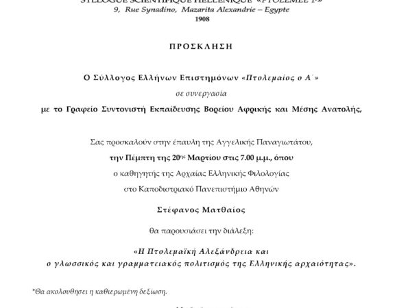 Την Δευτέρα 10 Μαρτίου 2025, τα μέλη και φίλοι του Συνδέσμου Αιγυπτιωτών Ελλήνων είχαμε την τύχη να παρακολουθήσουμε μια εξαιρετική ομιλία της Ρέας Δελβερούδη, Καθηγήτρια Γενικής […]