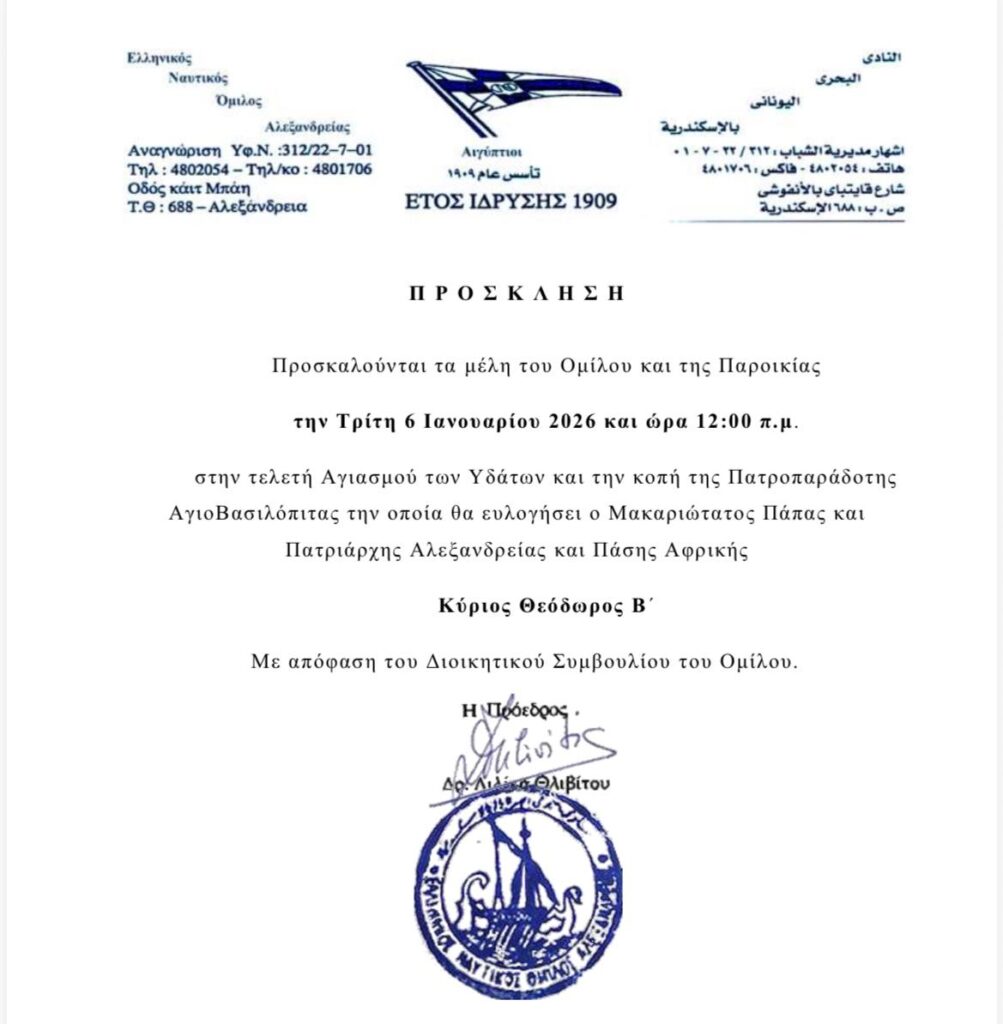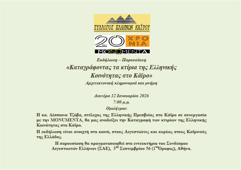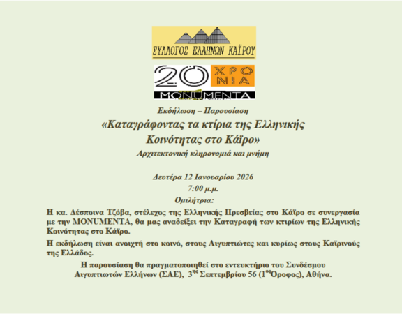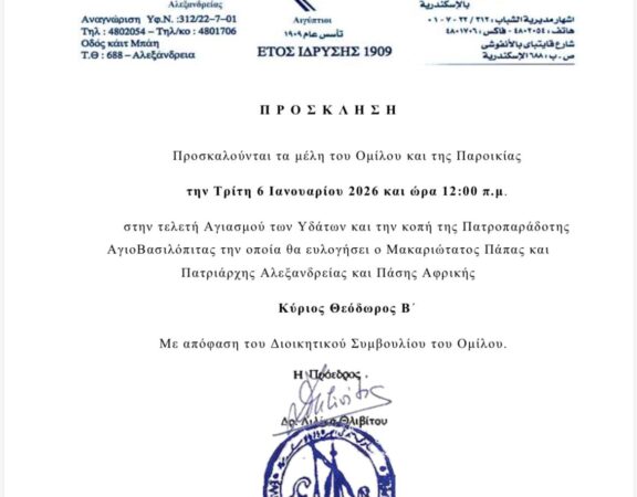 Ελληνικό Κέντρο Καΐρου Στο Ελληνικό Κέντρο Καΐρου με τον πολύχρωμο εορταστικό του διάκοσμο, πραγματοποιήθηκε την Δευτέρα 12 Ιανουαρίου 2026 Ημερίδα μέσω της οποίας εμπλουτίστηκε η γνώση […]