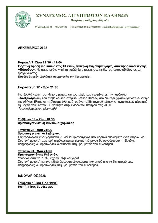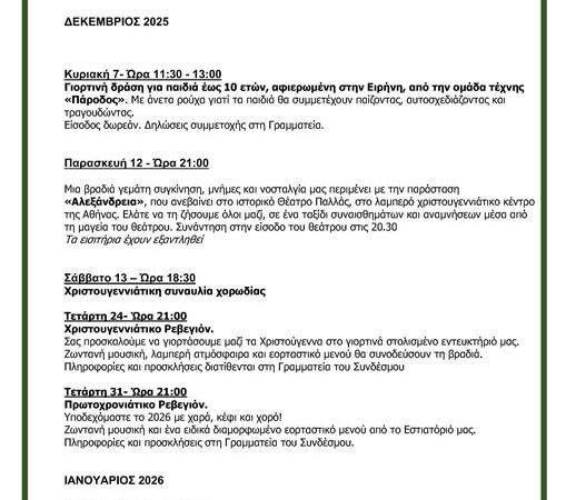 Πρόσκληση Εορταγοράς Λυκείου Ελληνίδων Το Λύκειον των Ελληνίδων Γραφείον Αλεξάνδρειας σας προσκαλεί στην Χριστουγεννιάτικη Εορταγορά που θα λάβει χώρα την Παρασκευή 5 Δεκεμβρίου 2025 και ώρα […]
