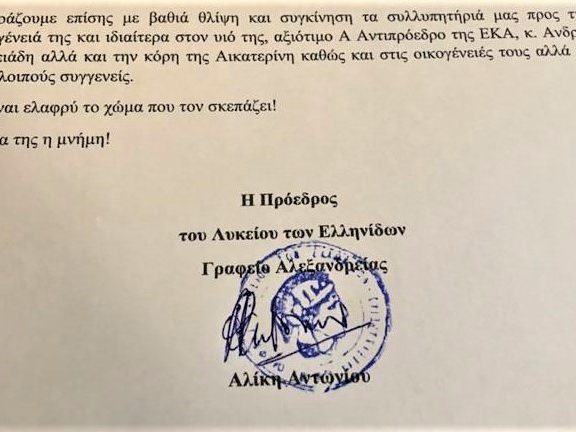 Τη μεγάλη θλίψη της για την απώλεια της Ελένης Βαφειάδη εξέφρασε με συλλυπητήρια επιστολή της η Ελληνική Κοινότητα Αλεξανδρείας, που υπογράφει ο Πρόεδρος της ΕΚΑ κ. […]