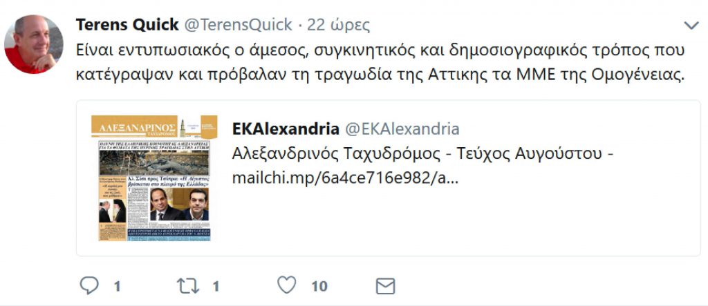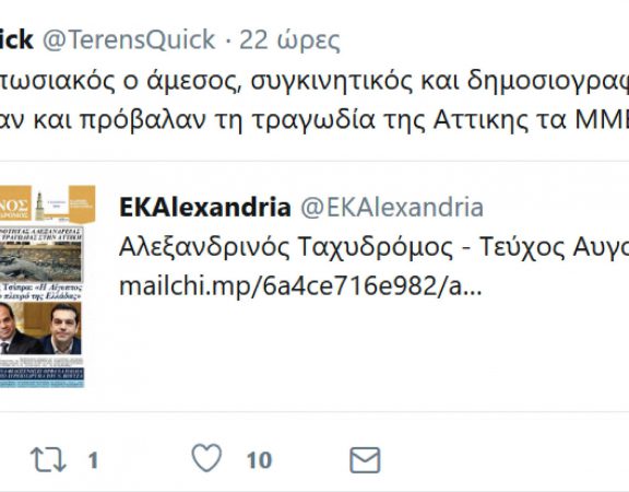 «Είναι εντυπωσιακός ο άμεσος, συγκινητικός και δημοσιογραφικός τρόπος που κατέγραψαν και πρόβαλαν την τραγωδία της Αττικής τα ΜΜΕ της Ομογένειας», έγραψε στο προσωπικό του λογαριασμό στο […]