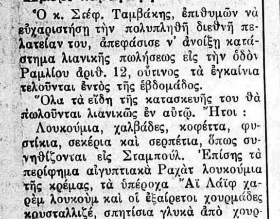 Διαφήμιση του γνωστού εργοστασίου ειδών τροφίμων του Στέφανου Ταμβάκη, με την οποία ο ιδιοκτήτης ενημερώνει για τα εγκαίνεια του καταστήματος λιανικής πώλησης ειδών τροφίμων. Η διαφήμιση […]