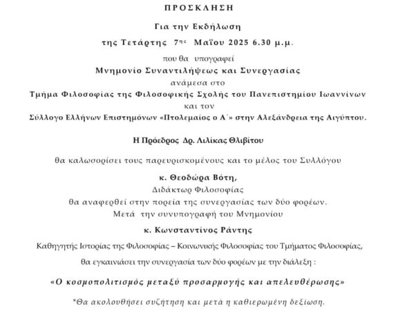συν ΠΡΟΣΚΛΗΣΗ ΣΤΟΝ ΠΤΟΛΕΜΑΙΟ Α΄ Μια εξαιρετική και απολύτως εποικοδομητική συνεργασία μέσω ενός Μνημονίου, πρόκειται να λάβει χώρα στον «Πτολεμαίο Α΄» την 7η Μαΐου 2025 και […]
