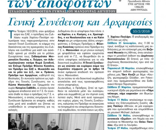 Η τρίμηνη έκδοση Ιανουαρίου, Φεβρουαρίου, Μαρτίου του περιοδικού «Η γλαύκα των αποφοίτων» του Συλλόγου Αποφοίτων Γυμνασίου Μανσούρας Αιγύπτου κυκλοφόρησε. Πλούσιο για μία ακόμη φορά το υλικό […]