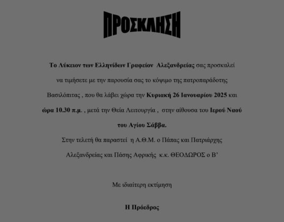 ΛΥΚΕΙΟΝ ΤΩΝ ΕΛΛΗΝΙΔΩΝ ΓΡΑΦΕΙΟΝ ΑΛΕΞΑΝΔΡΕΙΑΣ Το Λύκειον των Ελληνίδων Γραφείον Αλεξανδρείας σας προσκαλεί να τιμήσετε με την παρουσία σας το κόψιμο της πατροπαράδοτης Βασιλόπιτας , που […]