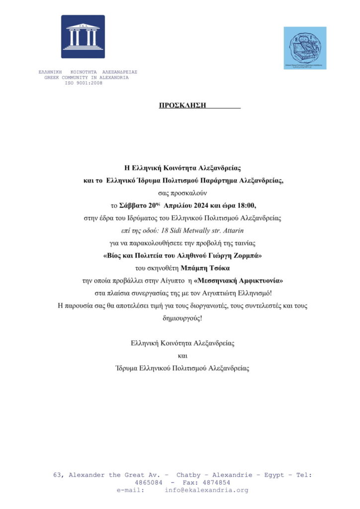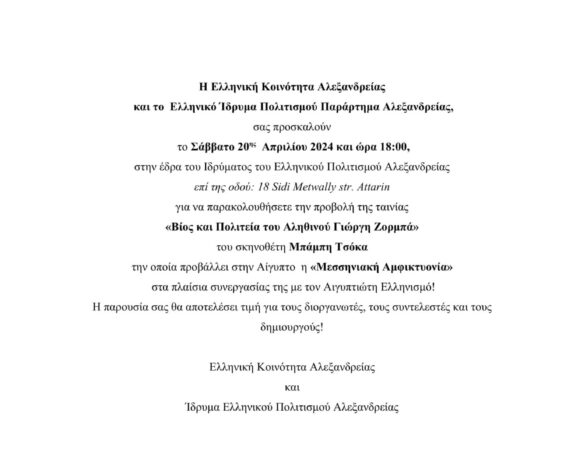 Η Ελληνική Κοινότητα Αλεξανδρείας και το Ελληνικό Ίδρυμα Πολιτισμού Παράρτημα Αλεξανδρείας, σας προσκαλούν το Σάββατο 20ης Απριλίου 2024 και ώρα 18:00, στην έδρα του Ιδρύματος του […]