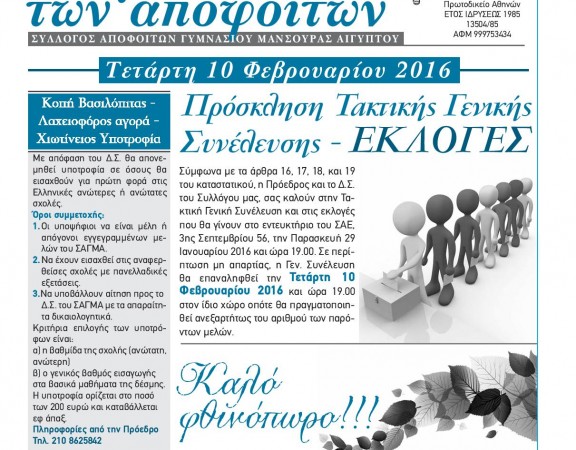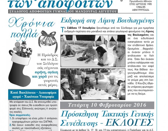 Η τρίμηνη έκδοση Οκτωβρίου-Νοεμβρίου-Δεκεμβρίου του περιοδικού «Η γλαύκα των αποφοίτων» του Συλλόγου Αποφοίτων Γυμνασίου Μανσούρας Αιγύπτου κυκλοφόρησε. Πλούσιο για μία ακόμη φορά το υλικό και αυτού […]