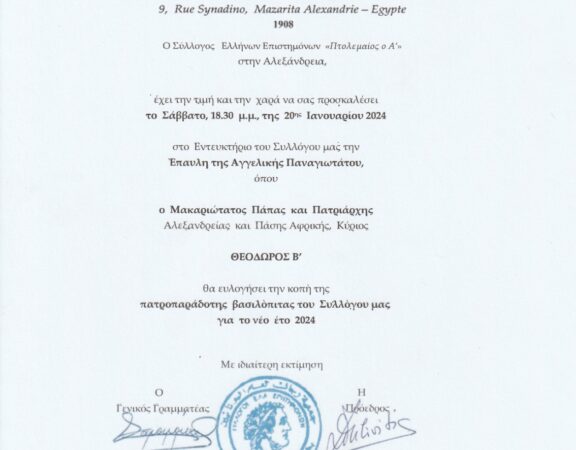 Ο Σύλλογος Ελλήνων Επιστημόνων «Πτολεμαίος ο Α΄» στην Αλεξάνδρεια, προσκαλεί την Παροικία το Σάββατο 20ης Ιανουαρίου 2024 και ώρα 18:30 στο Εντευκτήριο του Συλλόγου του, στην […]