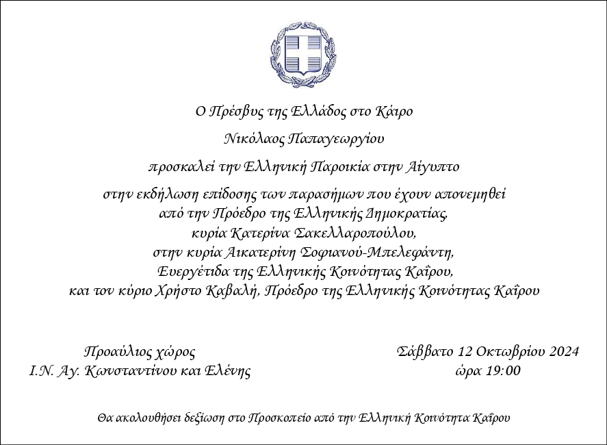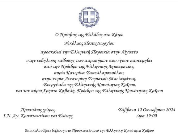 Ο Έλληνας Πρέσβυς στο Κάϊρο κ. Νικόλαος Ππαγεωργίου, προσκαλεί σύμπασα την Ελληνική Παροικία στην Αίγυπτο, στην τελετή επιίδοσης των παρασήμων που έχουν επιδοθεί από την Πρόεδρο […]