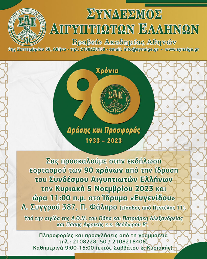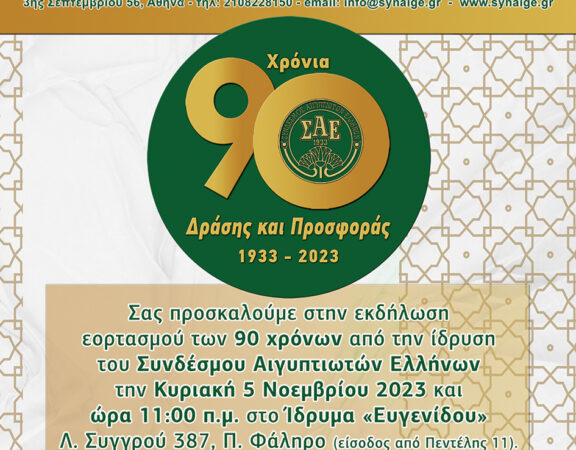 Ο Σύνδεσμος Αιγυπτιωτών Ελλήνων σας προσκαλεί να τον τιμήσετε με την παρουσία σας την ΚΥΡΙΑΚΗ 5 ΝΟΕΜΒΡΙΟΥ 2023 και ώρα 11:00 π.μ. στο Ίδρυμα «Ευγενίδου» τον […]