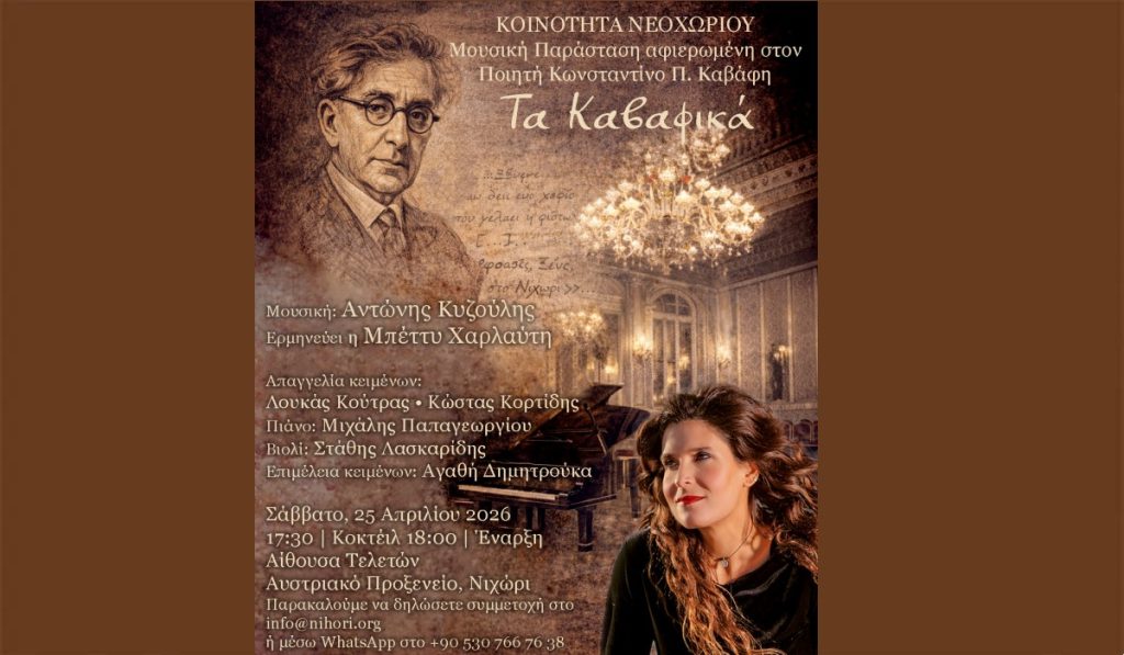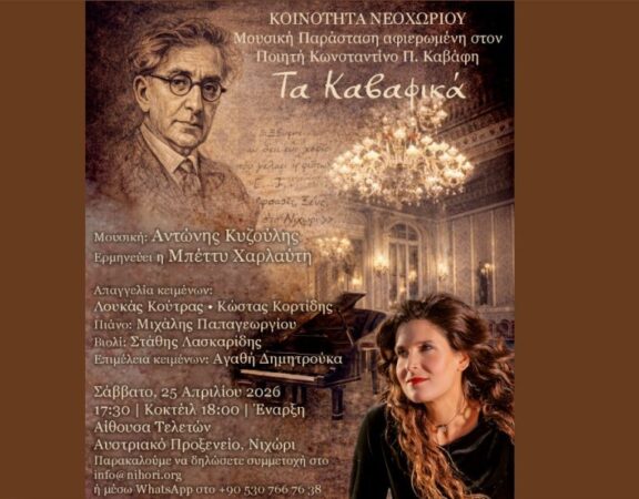 Η Κοινότητα Νεοχωρίου διοργανώνει το Σάββατο 25 Απριλίου 2026, στην Αίθουσα Τελετών του Αυστριακού Προξενείου στο Νιχώρι, τη μουσική και λογοτεχνική παράσταση «Τα Καβαφικά», μια ετήσια […]