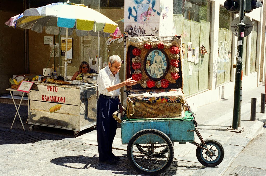 Laterna (piano barrels) players once walked up and down the streets with their instruments. Made popular by the film, “Laterna, poverty and goodwill” (Laterna, Ftohia ke filotimo) and its sequel, the laterna players survived on the kindness of passers-by. Now, they need to cut receipts for their donations.
